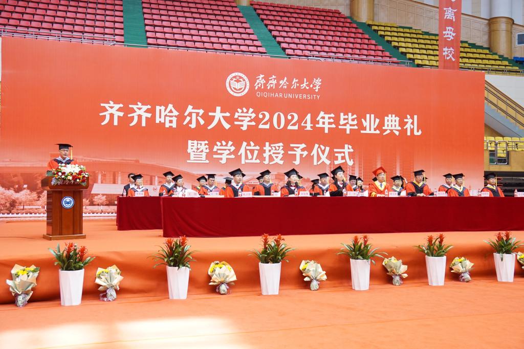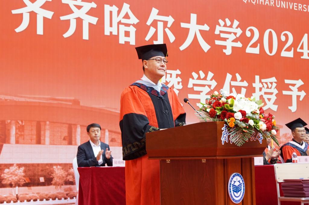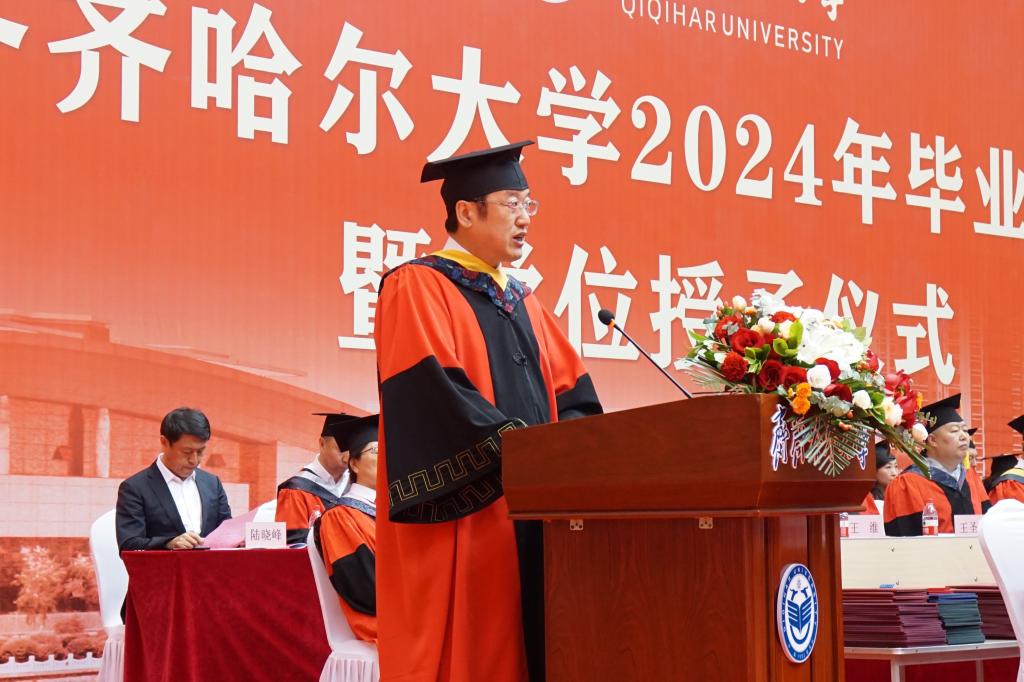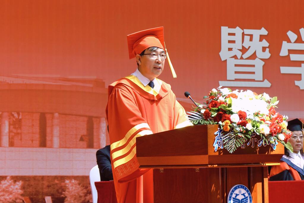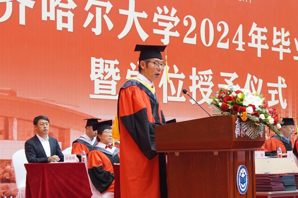 校学位评定委员会主席、校长郝文斌在毕业典礼上发表了讲话,他代表全校师生员工向全体毕业生致以最热烈的祝贺!向老师们、家长们致以最诚挚的谢意!向现场的家长代表表示最热烈的欢迎!他以“不一样的齐大 不一样的自己”为题,让毕业生们再一次回望朝夕相处的母校,感受不一样的齐大。他说,不一样的齐大,是底蕴深厚的齐大;不一样的齐大,是实力强劲的齐大;不一样的齐大,是特色鲜明的齐大;不一样的齐大,是充满潜力的齐大;不一样的齐大,是饱含情怀的齐大。“感人心者,莫先乎情。”学校秉持爱生如子、爱师如亲、爱校如家的办学理念,努力让每一个学生感受到齐大的温暖。齐大的爱,是传承中华文化,相互陪伴;齐大的爱,是知微见著、关怀备至。今天之后,大家在齐大的身份认证将从“学生”变成“校友”,请带着母校的浓情厚爱,披荆斩棘、勇毅前行!