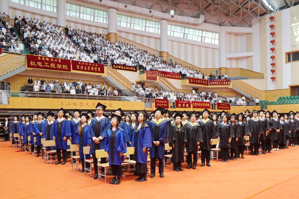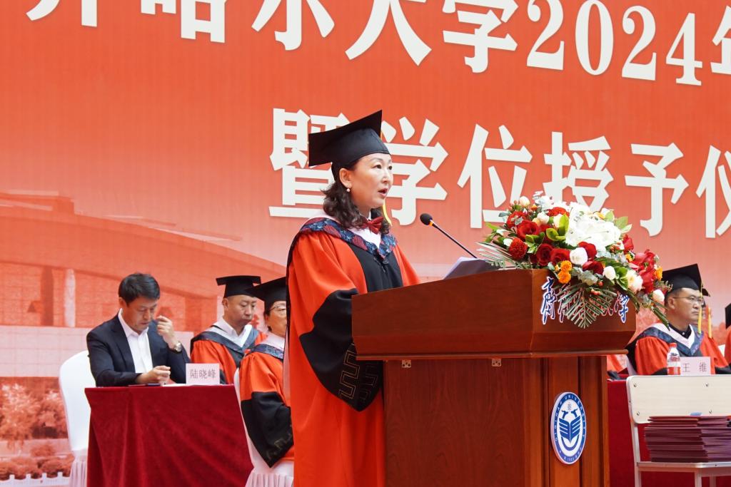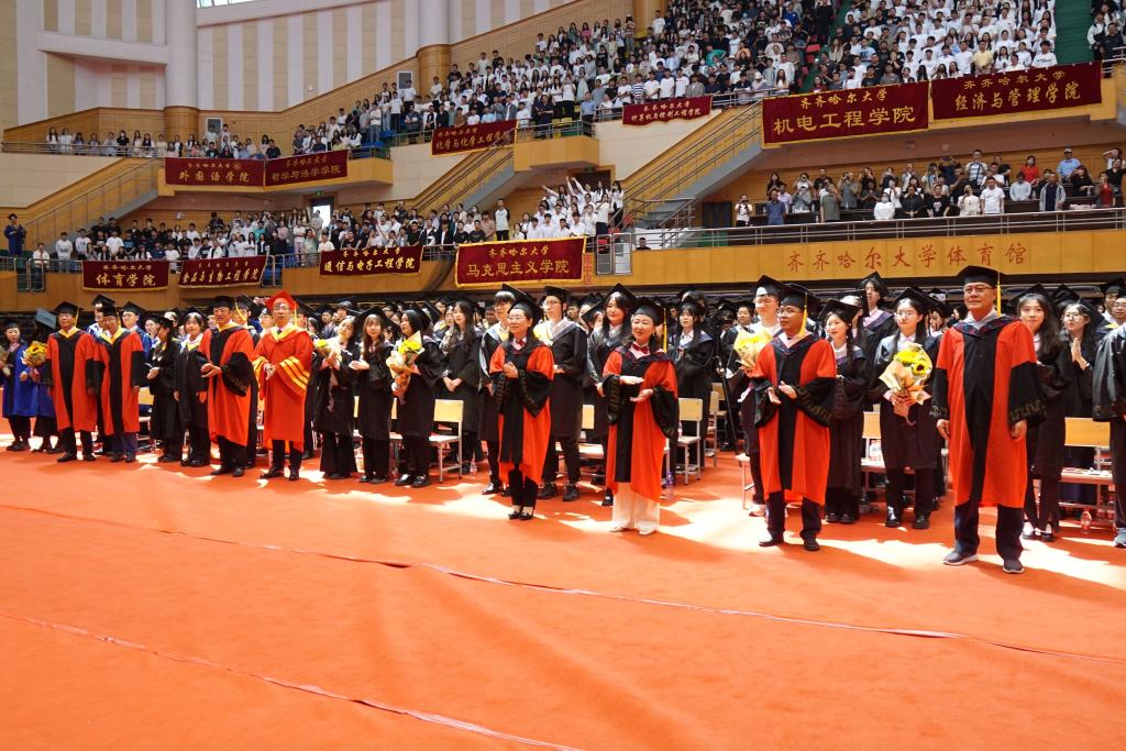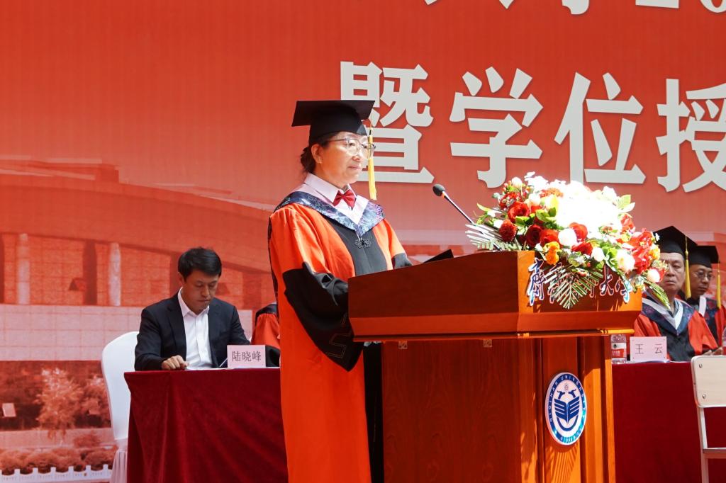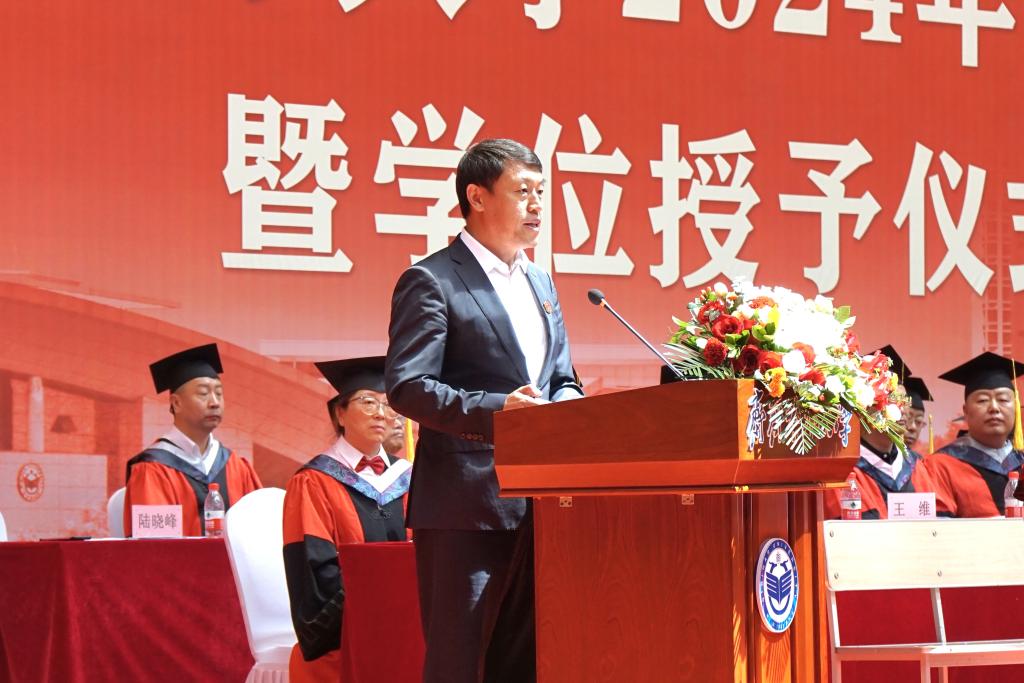 校学位评定委员会主席、校长郝文斌在毕业典礼上发表了讲话,他代表全校师生员工向全体毕业生致以最热烈的祝贺!向老师们、家长们致以最诚挚的谢意!向现场的家长代表表示最热烈的欢迎!他以“不一样的齐大 不一样的自己”为题,让毕业生们再一次回望朝夕相处的母校,感受不一样的齐大。他说,不一样的齐大,是底蕴深厚的齐大;不一样的齐大,是实力强劲的齐大;不一样的齐大,是特色鲜明的齐大;不一样的齐大,是充满潜力的齐大;不一样的齐大,是饱含情怀的齐大。“感人心者,莫先乎情。”学校秉持爱生如子、爱师如亲、爱校如家的办学理念,努力让每一个学生感受到齐大的温暖。齐大的爱,是传承中华文化,相互陪伴;齐大的爱,是知微见著、关怀备至。今天之后,大家在齐大的身份认证将从“学生”变成“校友”,请带着母校的浓情厚爱,披荆斩棘、勇毅前行!