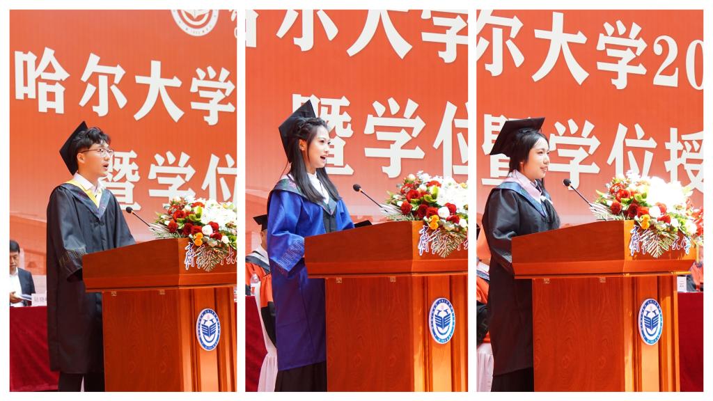 本科生毕业生代表、计算机与控制工程学院林欣严同学,研究生毕业生代表、文学与历史文化学院(新闻传播学院)姜易同学,留学生毕业生代表、来自泰国的王诗丽同学分别发言。