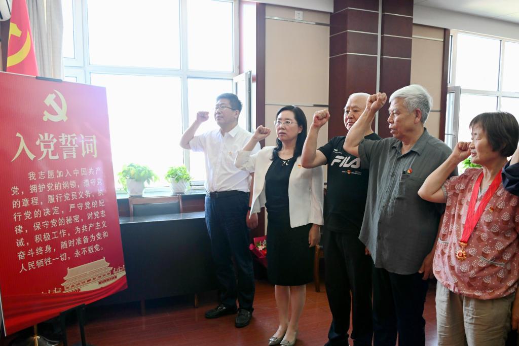 与会领导为“光荣在党50年”纪念章获得者、离退休党支部书记代表、退休党员代表敬献鲜花,并一起重温了入党誓词。