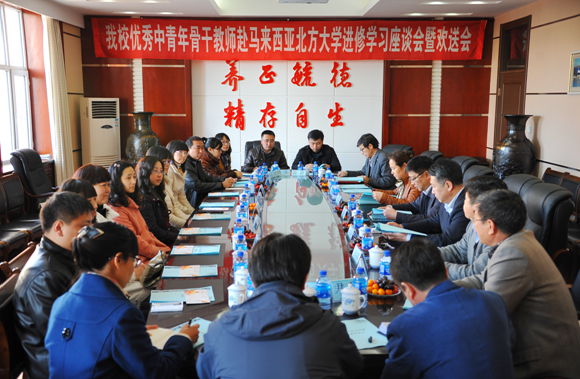 3月29日下午,beats365在行政楼504会议室,召开优秀中青年骨干教师赴马来西亚北方大学进修学习座谈会暨欢送会。校领导李海红、马立群、王凤琴、郑喜群、邓启刚、吕晓辉出席会议,并与各位教师亲切交流、座谈。