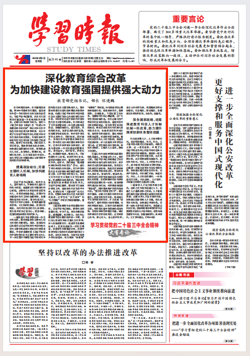 教育兴则国家兴,教育强则国家强。到2035年建成教育强国,是当前和今后一个时期教育改革发展的总目标。习近平总书记强调,从教育大国到教育强国是一个系统性跃升和质变,必须以改革创新为动力。党的二十届三中全会《决定》在“构建支持全面创新体制机制”部分对深化教育综合改革作出重大决策部署,充分体现了以习近平同志为核心的党中央对教育事业的高度重视,为做好新时代新征程教育改革发展工作指明了前进方向、提供了根本遵循。我们要深入学习领会、坚决贯彻落实全会精神,加快建设高质量教育体系,统筹推进育人方式、办学模式、管理体制、保障机制改革,以改革添动力增活力,奋力书写以教育强国建设支撑引领中国式现代化的新篇章。