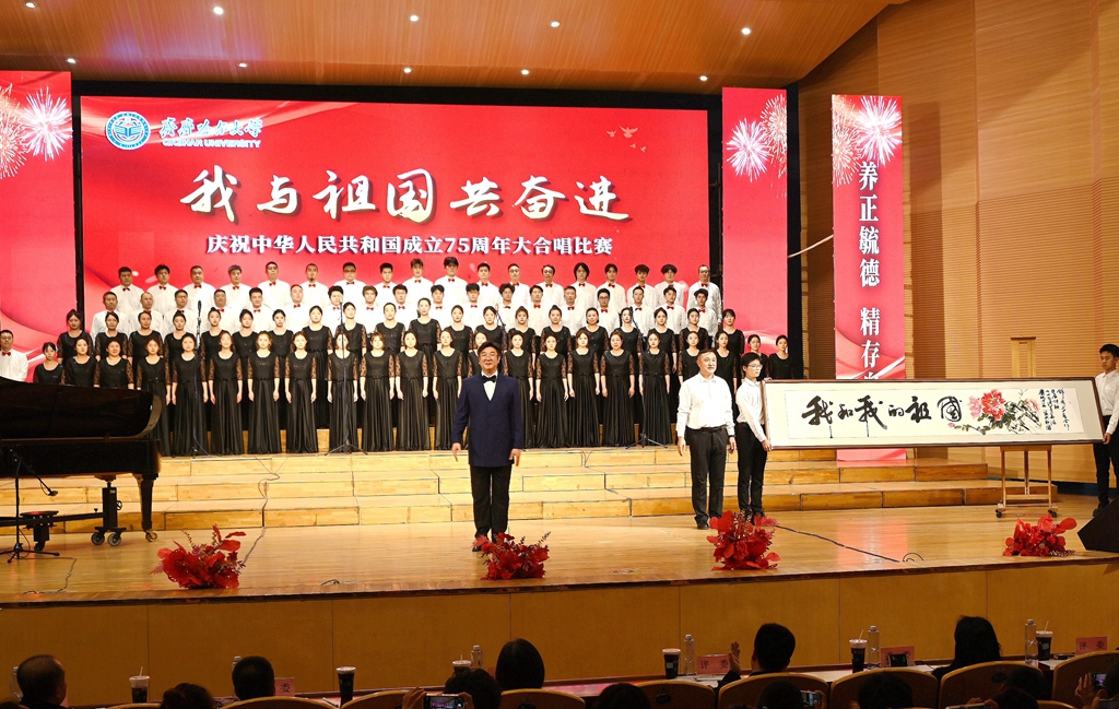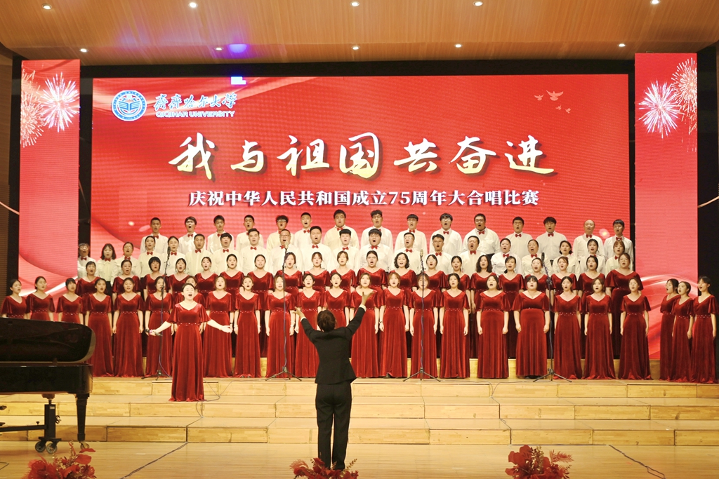大合唱在学校党委班子和机关、资产运营管理中心代表队共同演唱的经典歌曲《我和我的祖国》《我们走在大路上》中拉开序幕,深情的旋律瞬间点燃了全场的热情,干部师生们用歌声描绘了一幅新时代灿烂辉煌的壮丽画卷,表达了对伟大祖国的无限热爱与深情厚谊。