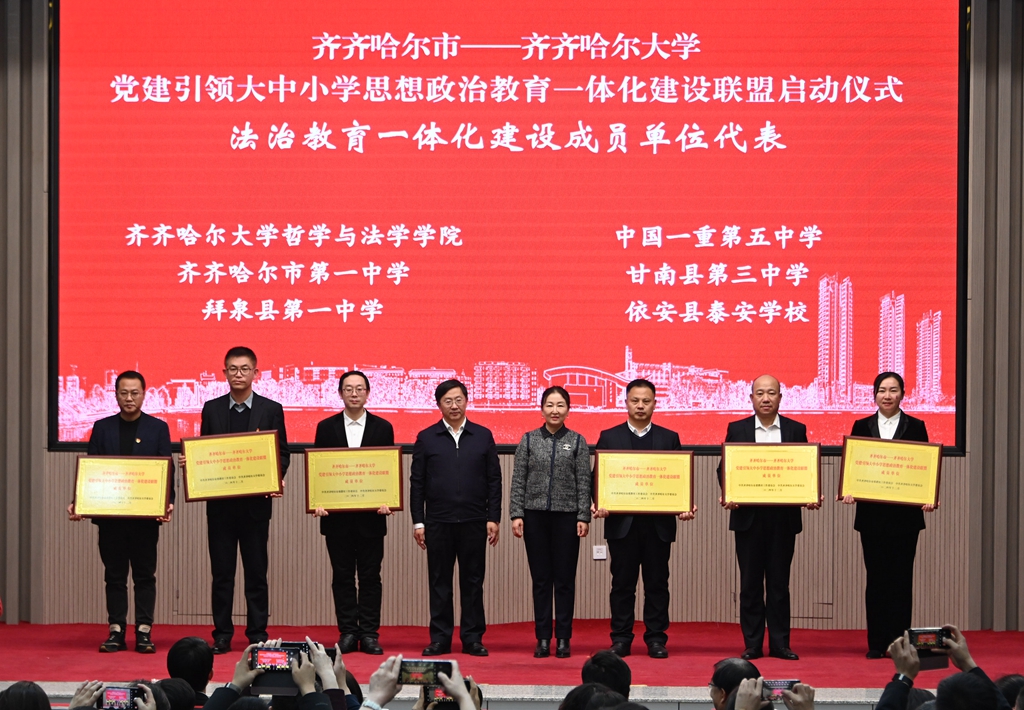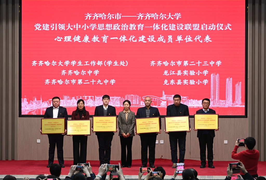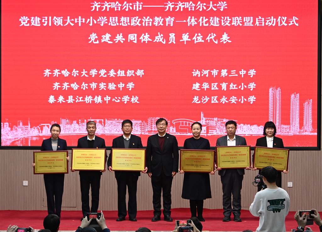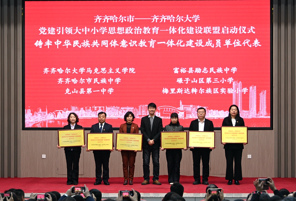 与会领导分别为“齐齐哈尔市—beats365唯一官方网站党建引领大中小学思想政治教育一体化建设联盟”成员单位代表授牌。