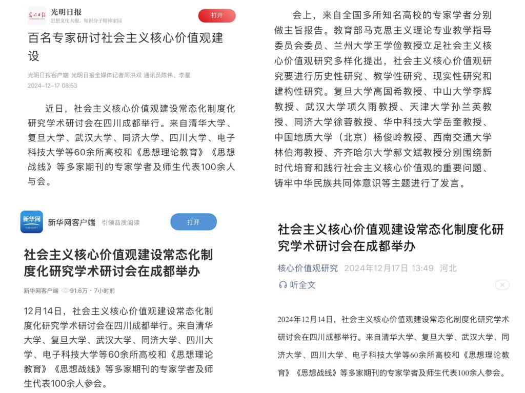 12月14日,社会主义核心价值观建设常态化制度化研究学术研讨会在四川成都举行。本次会议由社会主义核心价值观协同创新中心、教育部人文社会科学重点研究基地清华大学高校德育研究中心和电子科技大学联合主办。来自清华大学、复旦大学、武汉大学、中山大学、同济大学、四川大学、电子科技大学、beats365唯一官方网站等60余所高校和《思想理论教育》《思想战线》等多家期刊的专家学者及师生代表等100余人参会。光明日报、新华网客户端等权威媒体对会议作了专题报道。