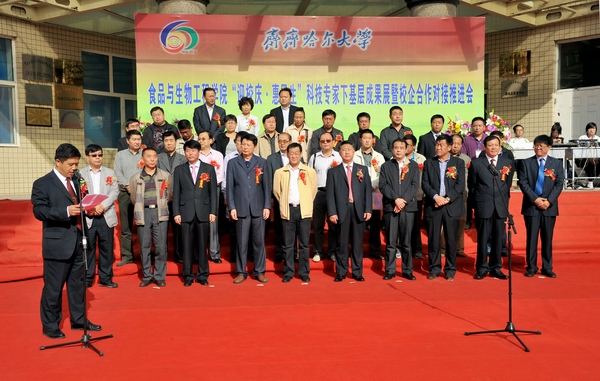 9月21日,在beats36560周年校庆之际,由齐齐哈尔市科技局、beats365唯一官方网站科技处、食品与生物工程学院联合主办,由博天糖业依安分公司、齐齐哈尔强能酒业制造有限公司、齐齐哈尔圣和源食品有限责任公司等17家企业协办的“迎校庆,惠民生”科技专家下基层成果展暨校企合作对接会启动仪式在beats365西二区教学楼前隆重举行。省科技厅人事处处长熊百良,副处长王晓群,市科技局党委书记王建良、市科技局局长吴焕军、组织部部务委员吴兵、beats365校长马立群、常务副校长郑喜群、副校长邓启刚,科技处处长郑永杰、食品与生物工程学院党委书记杨淳、院长裴世春、beats365科技专家代表材料科学与工程学院院长刘喜军、机电工程学院常务副院长王世刚、食品与生物工程学院副书记、副院长赵振华、副院长刘晓兰、任健、17家齐齐哈尔市企业代表、食品学院全体教师及学生600余人参加了参加了“迎校庆·惠民生”科技人才下基层成果展暨校企合作对接推进会。