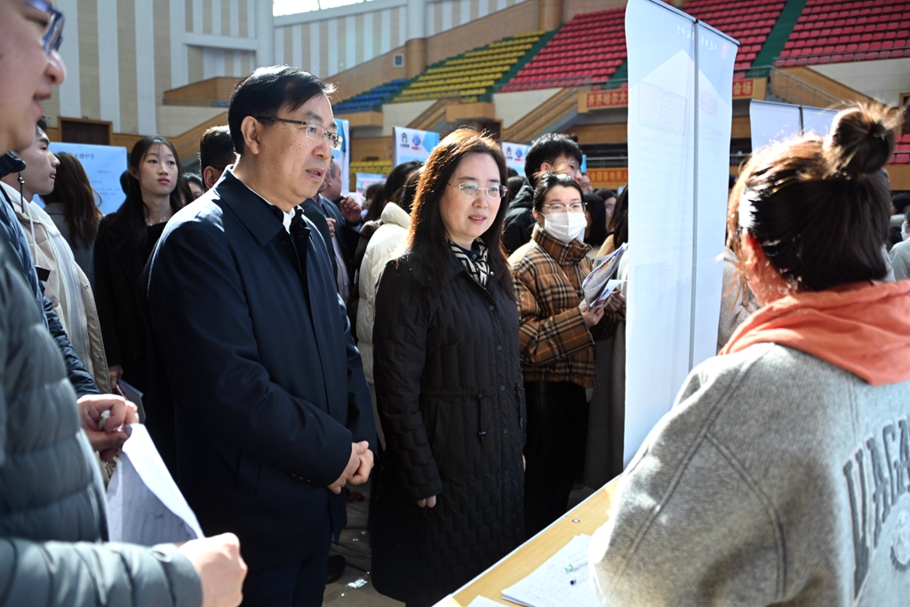 校党委书记丁宏,校长、党委副书记郝文斌等学校领导班子成员深入双选会现场走访交流,与宁波市宁海县人社局、山东省淄博市人社局等政府部门负责人共商人才引育机制,同泗阳桃州中学、大连市育才高级中学、特变电工山东鲁能电缆有限公司、正大天晴药业集团股份有限公司等重点用人单位代表探讨产教融合新路径,结合学科特色精准对接企业需求,并向求职学生详细了解职业规划与就业难点,现场为毕业生提供岗位匹配建议,构建起“政校企生”四方协同的就业服务生态。