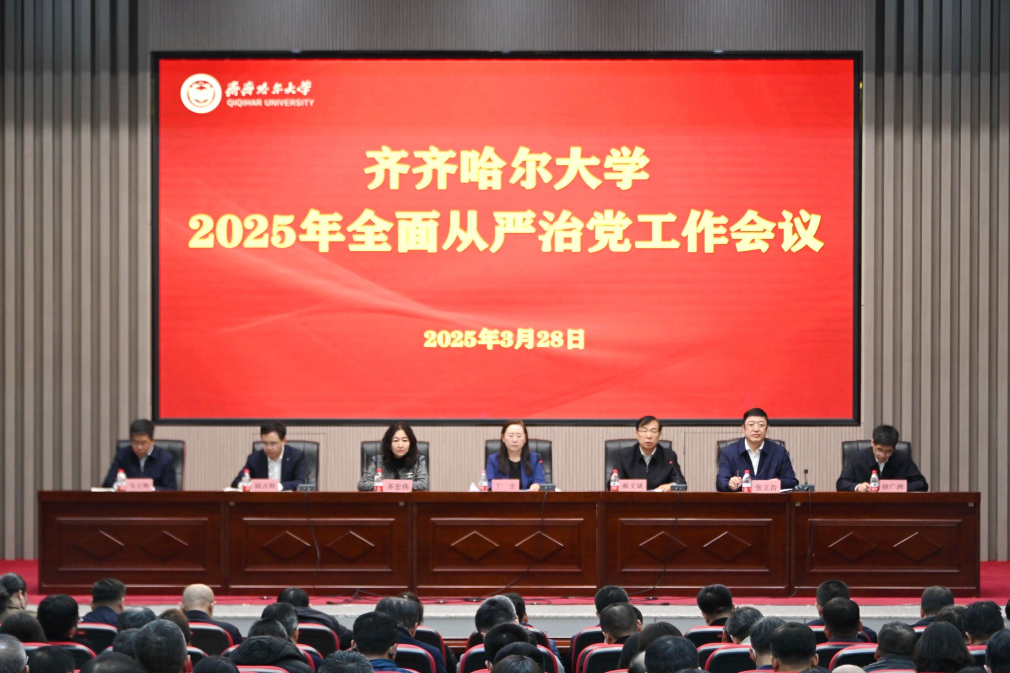 3月28日下午,学校在日新大厦四楼报告厅召开2025年全面从严治党工作会议,校领导丁宏、郝文斌、齐宏伟、张文治、陆占权、徐广洲、马文辉出席会议,全校副处级以上干部、校纪委委员、党风廉政建设监督员、专职纪检监察干部、二级单位纪检委员参加会议。会议由校长、党委副书记郝文斌主持。