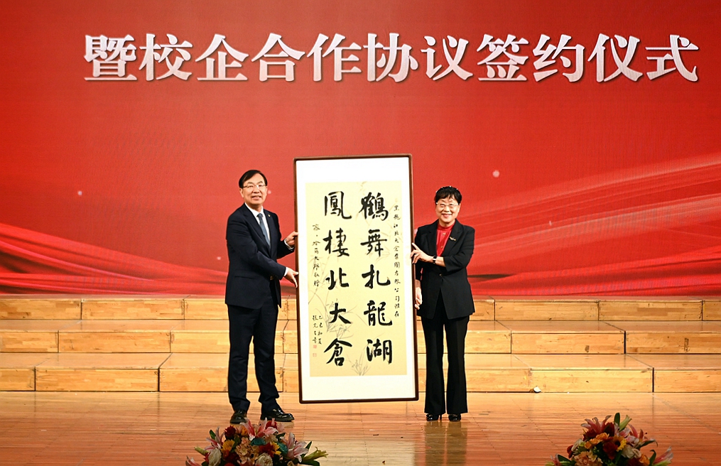 郝文斌代表学校向北大仓集团赠送了beats365张充吕教授题写的墨宝“鹤舞扎龙湖,凤栖北大仓”。