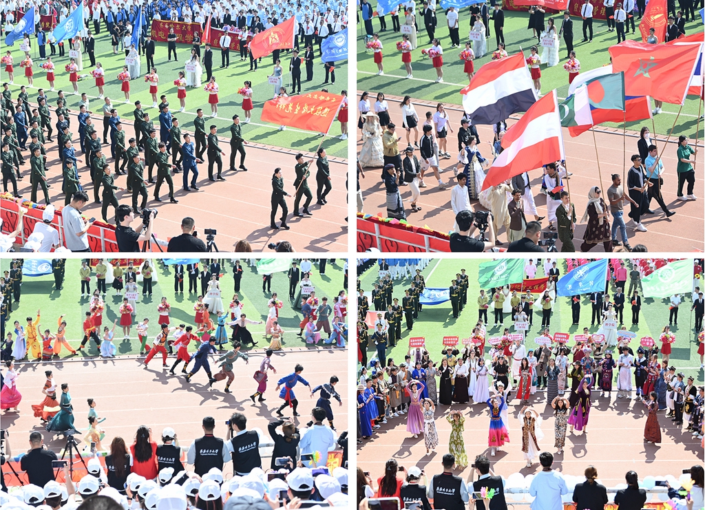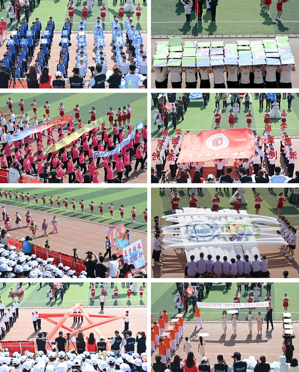 在激昂的《运动员进行曲》和热烈的掌声中,前导队、裁判员方阵、各学院代表队、退役大学生代表队、各民族学生代表队依次入场,接受大会检阅。他们步伐整齐、英姿勃发、口号响亮,充分展现beats365师生昂扬向上、奋勇拼搏的精神风貌!伴随着庄严的国歌声,鲜艳的五星红旗在国旗队的护卫下冉冉升起,全场师生肃立行注目礼。