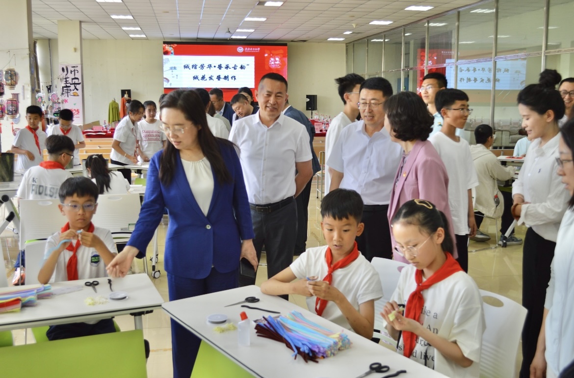 在非遗文化体验工坊环节,校地双方领导与大中小学生亲切互动,详细了解各体验区特色,热情投入匠心体验,感受非遗魅力。