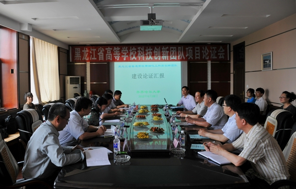 论证会专家组长由“国家杰出青年基金获得者”、“长江学者”大连理工大学张淑芬教授担任,成员由“国家杰出青年基金获得者” 获得者、北京大学黄建滨教授、中科院“百人计划”获得者、中科院大连化学物理研究所孙立贤研究员,中科院“百人计划”获得者、中科院过程工程研究所苏发兵研究员,“泰山学者”获得者中国石油大学康万利教授组成。黑龙江省教育厅科技处处长韩延平主持了论证会,校长马立群教授致辞并发表了重要讲话,创新团队负责人郭祥峰教授做了汇报,副校长邓启刚、科研处处长郑永杰、科研处副处长荆涛出了会议。