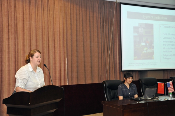 会谈结束后,美国驻沈阳总领事馆副文化领事吴剑向beats365图书馆赠送了图书。美国驻沈阳总领事馆Danielle Rossi女士、信息中心助理肖白为beats365学生做了美国高等教育情况专题讲座。