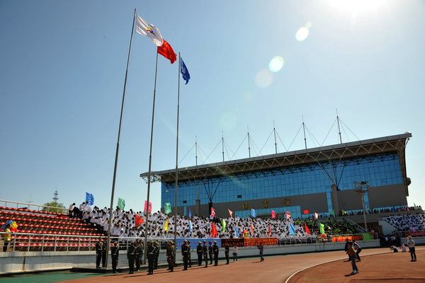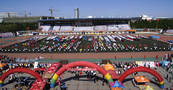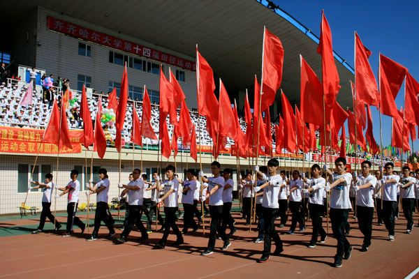 “创业、融合、跨越”,“凝神、聚力、发展”的彩练分外醒目鲜明,“以智慧和汗水诠释科学态度,以创新和奉献弘扬齐大精神,以思想和行动铸就爱国情怀,以青春和信念树立伟大理想”的大型条幅格外引人注目。西区体育场上,方阵猎猎,彩旗招展;体育健儿,英姿飒爽。