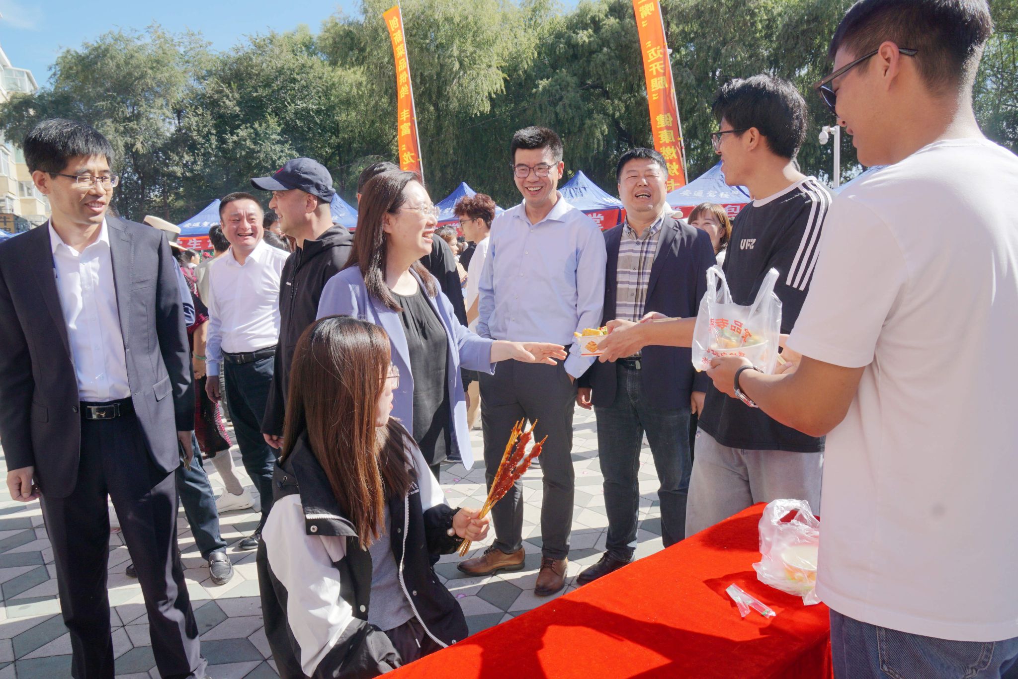 校党委书记丁宏宣布第四届校园美食展销节活动启动,校领导与嘉宾共同为师生分发蛋糕,送上美好祝福。