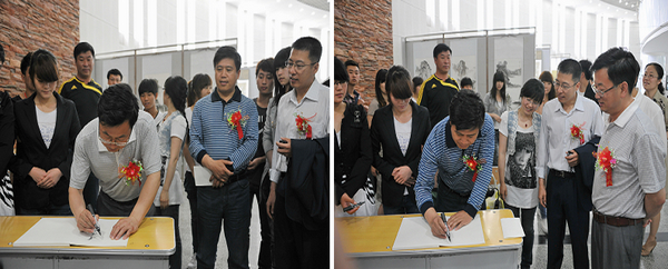 开幕式结束后,与会领导和师生代表一道观看了参展作品,并在留言簿上留言。