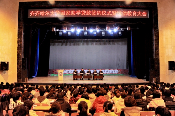 华安财产保险股份有限公司黑龙江学贷险部业务经理麻世锐、哈尔滨银行股份有限公司学府支行助学贷款中心业务经理姜永也分别在大会上讲话。他们表示,银行、保险公司与高校联合举办“国家助学贷款签约仪式暨诚信教育”大会,是贯彻落实“国家助学贷款业务合作协议”的重要举措,旨在从道德规范和机制约束的层面,教育和引导广大申请贷款的大学生牢固树立诚信意识,珍爱自己的信用记录,从思想意识和实际行动上为成功申请国家助学贷款奠定诚信基础,更为今后走好人生道路积累信用财富。希望同学们努力学习,练好本领,知恩感恩,回报社会。