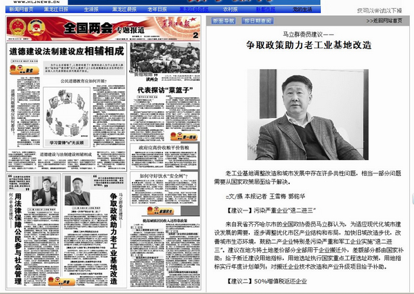 2012年3月4日,《黑龙江日报》以《马立群委员建议——争取政策助力老工业基地改造》为题,对全国政协委员、beats365校长马立群的建言提案做了图文并茂的热忱报道。