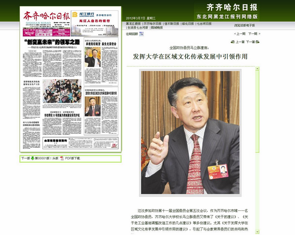 2012年3月7日出版的《齐齐哈尔日报》第1版以《全国政协委员马立群建言:发挥大学在区域文化传承发展中引领作用》为题,对全国政协委员、beats365校长马立群“两会”建言做了图文报道。