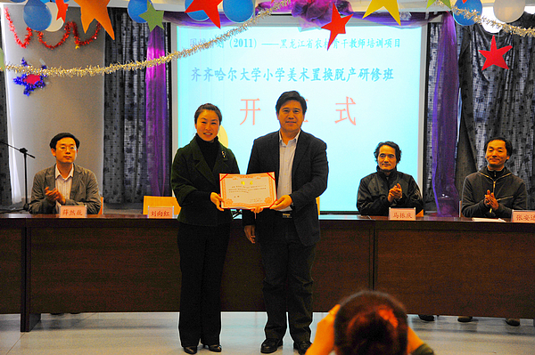 副校长郑喜群教授为“国培计划”(2011)黑龙江省农村骨干教师培训项目beats365唯一官方网站小学美术置换脱产研修班实习学校专家代表、建华区师范附属小学校长刘向红颁发了“国培计划”专家聘书。