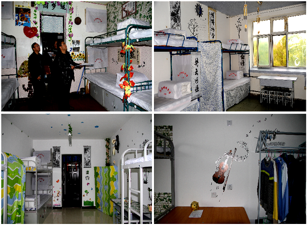 本次参赛寝室整体装饰设计充分体现出风格多样、个性鲜明、主题突出的特点。有的学生寝室用蓝、白、灰为三原色的方格设计天棚,给人以强烈的时代感、前卫风,使整体色调完美契合,赋予冷峻、沉着的理性思考意义;有的学生寝室以绿色为基调,突显宁静、自然、轻松的寝室环境和氛围;有的学生自己作画、书写对联,表明远大志向和同学情意;有的学生自己写下许愿的小贴士,设置了心愿墙、留言板,激励寝室成员团结一致、共同奋斗;有的学生寝室利用废弃纸盒自制收纳小盒、相框,自制绳编太阳花,用树叶粘贴成画,体现了学生为环保、为低碳生活出一份力的绵薄心意。