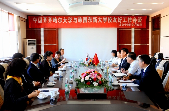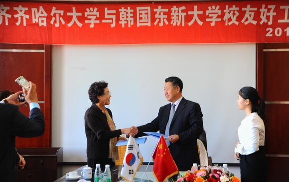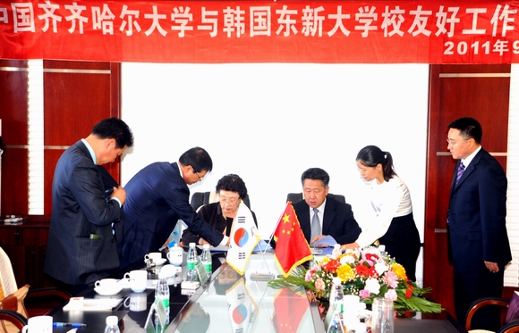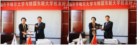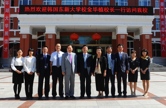 会谈结束后,马立群校长代表学校、金毕植校长代表韩国东新大学在两校合作办学有关文本协议上签字。会后,宾主双方互赠礼品并合影留念。
