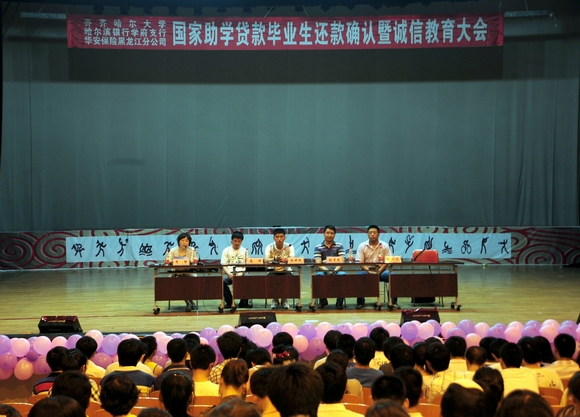 为全面贯彻落实国家助学贷款有关政策,认真履行beats365和哈尔滨银行学府支行于2007年8月所签订的“国家助学贷款全面合作协议”,6月20日,beats365召开了国家助学贷款毕业生还款确认暨诚信教育大会。学校财务处副处长张月武、学生工作处副处长张树启、哈尔滨银行学府支行经理高伟、华安保险黑龙江分公司经理麻世锐出席了本次还款确认会议。校学生工作处学生资助科老师、银行部分工作人员及全体哈尔滨银行国家助学贷款2011届毕业生参加了会议。会议由学生工作处学生资助科李静科长主持。
