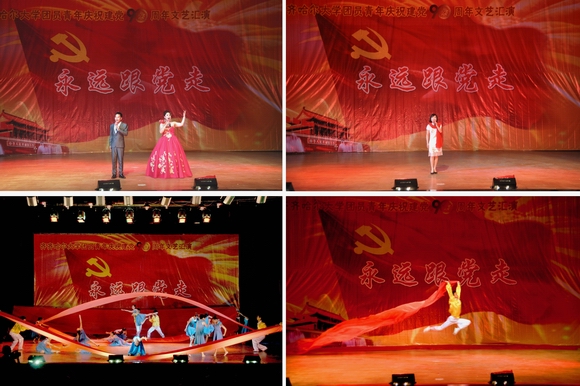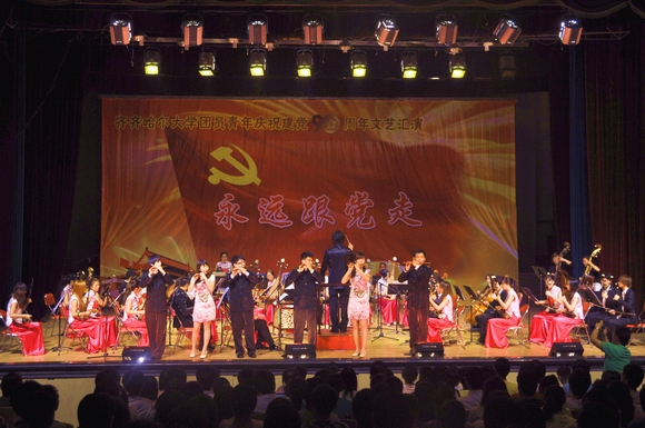 整台演出分为“红船领航程”、“灿烂阳光下”和“永远跟党走”三个篇章,内容丰富、特色鲜明、异彩纷呈。师生们通过歌曲、舞蹈、器乐、校园情景剧、诗朗诵、大合唱等,回顾了党的90载风雨征程,热情讴歌党的丰功伟绩。特别是原创诗朗诵《我们的称号》,用雄浑高亢的声音吟诵出全校团员青年对母校的热爱和赞美;外籍留学生演唱的小合唱《明天会更好》,表达了不同种族、不同民族青年“同一个世界、同一个梦想”的共同心愿;继续教育学院新疆班的民族舞蹈《故乡的思念》,表达了五十六个民族血脉相连、携手并肩走向灿烂辉煌的美好祝愿;反映大学生毕业生援藏题材的校园情景剧《雪域的守候》,表现了齐大学子以振兴中华为己任、以祖国繁荣昌盛为理想,甘于奉献的优秀品质,志存高远、建设边疆的高尚情操,为党和人民建功立业的壮志豪情。演员们的精彩表演深深打动了现场的每一位观众,现场时而寂然无声,时而热烈沸腾,雷鸣般的掌声一次次在剧场里响起。最后,演出在大合唱《怒吼吧黄河》中落下帷幕。演出结束后,与会领导走上舞台,同全体演职人员亲切握手,并合影留念。