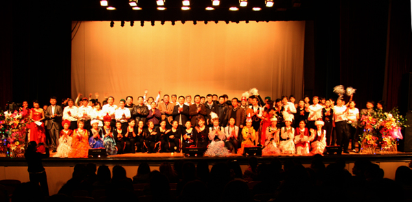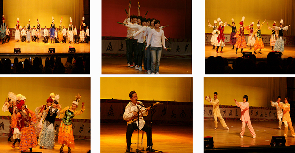来自新疆的培训学员表演了男声独唱《母亲》、《可爱的一支玫瑰花》、独舞《春天的阳光》、群舞《草原歌声》、现代舞《舞动青春》、女声独唱《爱的代价》、《亲爱的母亲》以及印度舞《燃烧的太阳》以及冬不拉独奏等精彩节目,赢得了现场师生的热烈掌声。教育与传媒学院《青春校园》栏目组同学也表演了舞蹈《非诚勿扰》、滑稽舞蹈《黄瓜也有春天》、独唱《火苗》、《青花瓷》及“三十七式太极拳”等幽默欢快的文艺节目。最后,全场联欢活动在师生携手歌舞《故乡思念》中圆满落幕。校党委书记李海红等登台与各族师生合影留念。