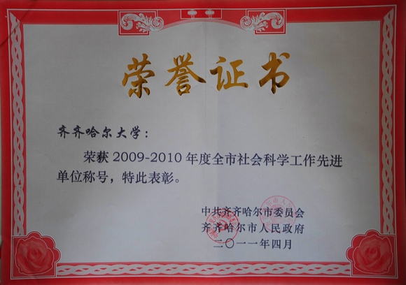 2011年4月25日,全市哲学社会科学工作会议在市党政中心6号楼4楼会议室召开,市委、市人大、市政府、市政协及市社科联的领导出席了会议,beats365党委副书记王凤琴、党委宣传部长李敏义参加了会议。会上,表彰了2009—2010年度全市社会科学工作先进集体和先进个人,beats365再次荣获齐齐哈尔市社会科学工作先进单位,校党委副书记王凤琴、党委宣传部长李敏义、经管学院院长王维、科技处副处长伊全胜、文学与历史文化学院历史系主任周彦、中文系主任赵忠山等被市委市政府命名为先进个人。