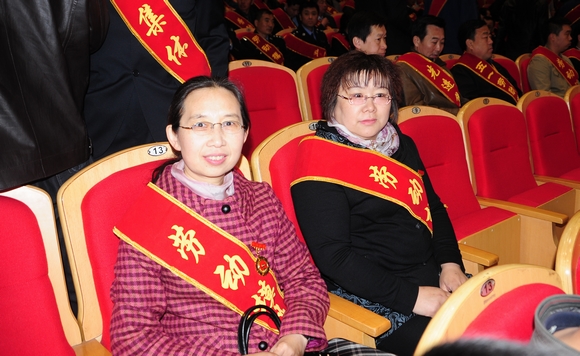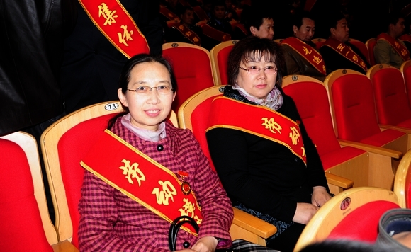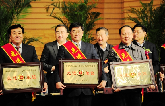 校工会主席吕晓辉代表学校登台领取“齐齐哈尔市第二十九届劳模大会先进单位”荣誉奖牌。市“五一劳动奖章获得者”郭成宇教授作为获奖者代表登台领奖。