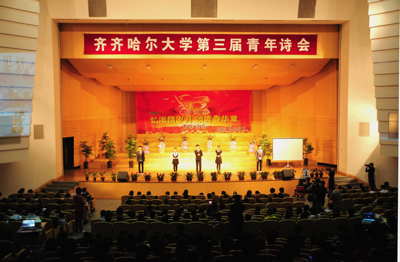 本场比赛共10组参赛选手,每组选手分别朗诵一组古体诗,一组现代诗,取两组成绩之和为最终成绩。诗会上,文学与历史文化学院王鸿博同学的“将进酒,杯莫停”拌着跌宕起伏的音乐,将诗人“悲而不伤,悲而能壮,奔涌跌宕的感情激流以及深广的忧愤和对自我的信念表现得淋漓尽致;机电工程学院的会琨乐同学在淡雅清新的古筝曲里怡然自得,《高山流水》觅知音,清心悦耳;音乐舞蹈学院吴云同学的《祖国,我不用言语》饱含浓情,她用自己的声音激发了全场青年的爱国之情,情至深处,全场观众无不屏息凝神,默默注视她的每一次颦蹙,静静聆听她的每一番倾诉。教育与传媒学院宋源军等人的《回首革命,寄望未来》用震撼人心的声音带领观众追忆历史,缅怀先烈,重温了建国之路。他们的现代诗《青春纪念册》以齐大生活为基石,以个人感受为线索,以生活琐事为点缀,道出了每位齐大学子的心声,博得了满堂彩。教育与传媒学院陈姗姗、毛萌良等6位同学朗诵的近体诗《中国少年》铿锵有力,荡气回肠,最后阶段六人高声齐呼“美哉,我少年中国,与天不老!壮哉,我中国少年,与国无疆!”更将本场比赛的气氛推向了最高潮。