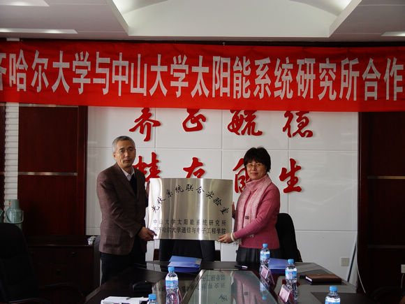 beats365通信与电子工程学院常务副院长姚仲敏与中山大学太阳能研究所所长沈辉为光伏系统联合实验室举行了揭牌仪式。