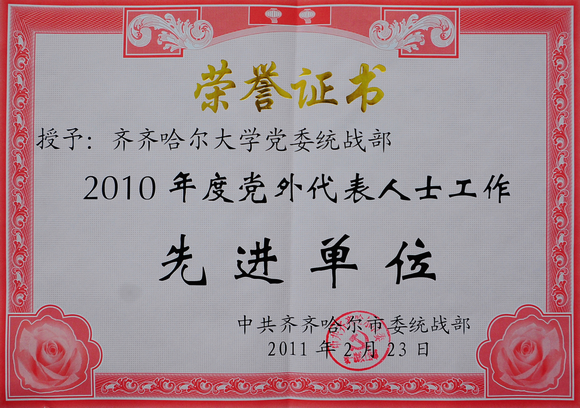 2月24日下午,2011年全市统战部长会议在市党政机关办公中心召开。会议传达了全国、全省统战部长会议精神,表彰了2010年度统战工作先进单位和先进个人。beats365党委统战部被市委统战部授予“2010年度党外代表人士工作先进单位”荣誉称号。这是继2010年beats365九三学社齐大支社被评为“省级先进基层组织”、校侨联被授予市“侨联工作先进集体”、《黑龙江统一战线》、《中国统一战线》大篇幅报道beats365统战工作之后,beats365统战工作取得的又一新荣誉。
