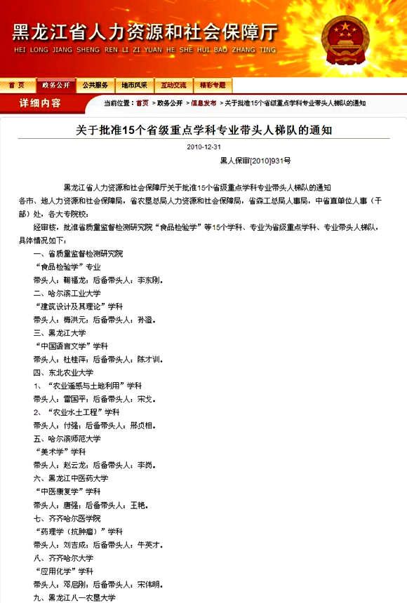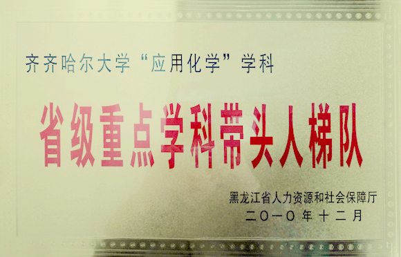 根据《黑龙江省人力资源和社会保障厅关于批准15个省级重点学科专业带头人梯队的通知》(黑人保审[2010]931号),beats365以副校长邓启刚教授为学科带头人的省级重点学科“应用化学”学科梯队被批准为省级重点学科带头人梯队。这是beats365获得的首个省级重点学科带头人梯队。