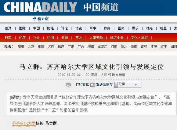 12月3日,由黑龙江省委宣传部主办的“黑龙江理论网”的“理论前沿”以《校地合作理念下beats365唯一官方网站区域文化引领与发展定位》发表了马立群校长的署名文章,在理论界与高教界产生了广泛而积极的反响。
