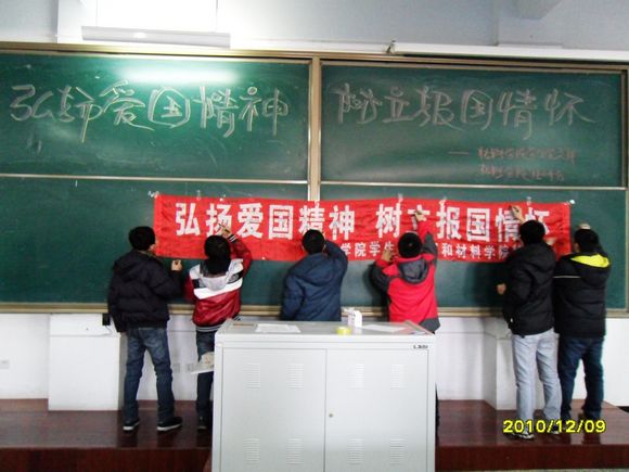 在“一二·九运动”75周年来临之际,各学院、各单位也以不同形式开展纪念活动,在全体青年学生中掀起以“铭记历史、不忘国耻、振兴中华”为主题的爱国主义教育热潮。文学与历史文化学院举办了纪念一二·九运动七十五周年主题演讲比赛;理学院举办了“一二·九薪火传承”座谈会;化学与化学工程学院举办了“不忘国耻,振兴中华”读书报告会;材料科学与工程学院千名学子在“弘扬爱国精神,树立报国情怀”的条幅上签名;国际交流学院团委组织的“纪念一二·九运动诗歌朗诵”在德润大厦唱响,《国魂下的赤诚》、《碧血丰碑》等作品抒发了同学们“树爱国之心·立报国之志”的理想;教育与传媒学院学院团委组织开展了团干部培训大会,面对着火红的国旗,他们做出“铭记历史·心系祖国·勇担使命”的爱国宣言……。