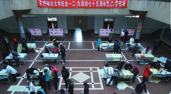 为纪念“一二·九”学生爱国运动75周年,弘扬爱国主义精神,增强青年学生的责任感和使命感。12月8日下午,由校团委、校社团联合会主办,校书法协会承办的纪念“一二·九”运动75周年现场书法大赛与图片展在西主教学楼举行。齐齐哈尔市书法协会书法家刘智信、第四届校书法协会会长钟祥海以及第五届校书法协会会长郭丽玲,担任书法比赛评委。