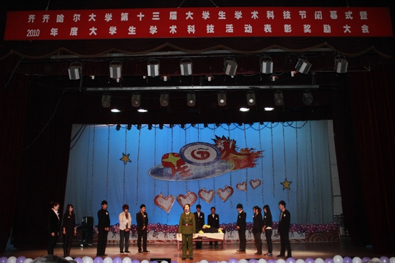 闭幕式后,与会领导与全体师生一起观看由校学生中国特色社会主义理论体系研究会精心排演的校园话剧《星火》2010 年度首场演出。