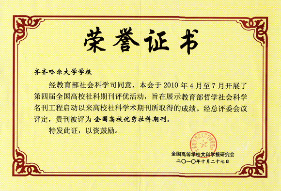 全国高校社科期刊评优活动每四年举办一次,是教育部“名刊名栏工程”的一项重要内容,是对高校办刊水准和编刊质量的综合检阅,是全国高校社科期刊最高层次、最权威的评奖。