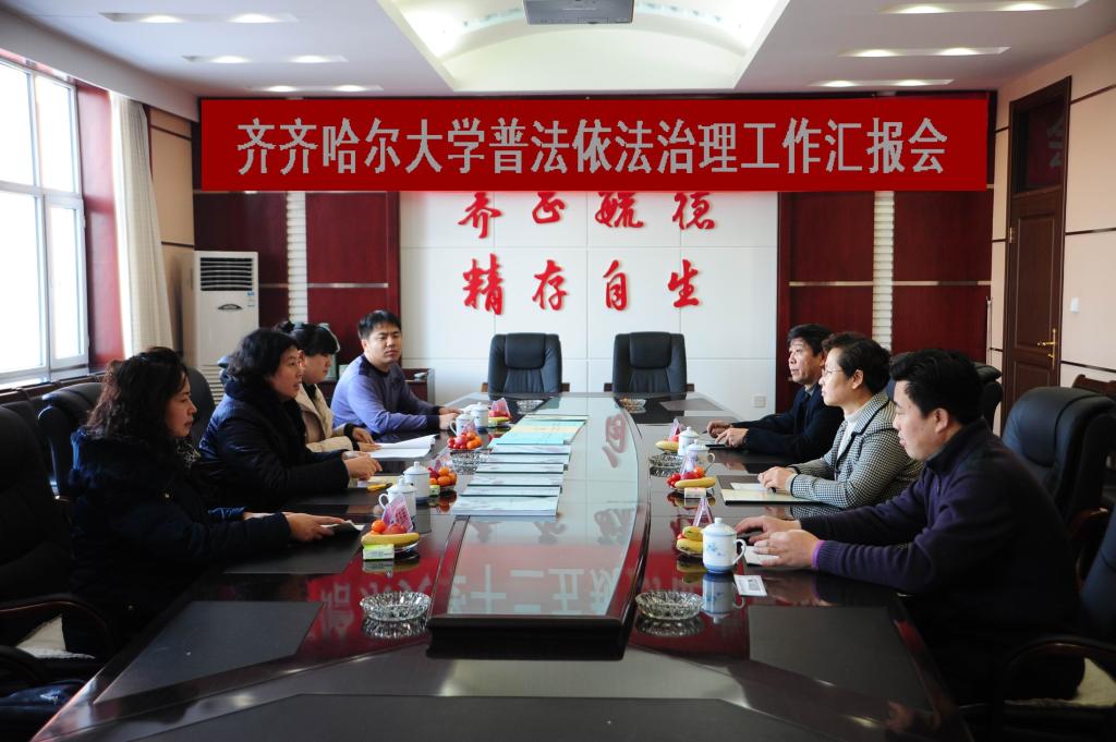 王凤琴副书记代表学校对市委依法治市领导小组的到来表示欢迎,对市委依法治市领导小组对beats365普法依法治理工作的肯定表示感谢。就“六五”普法工作及学校今后普法依法治理工作讲了三点意见。一是深入开展普法依法治理工作,做好普法宣传教育工作,提高师生的法律意识。二是坚持依法治校,推进民主建设,加强民主监督,完善规章制度。三是充分利用学校自身的优势,在黑龙江省西部文化传承与发展活动中,搞好法制文化共建工作,积极开展专项课题研究,发挥学校在法制文化中的作用,与市内有关部门密切协作,为齐齐哈尔市普法依法治理工作贡献力量。