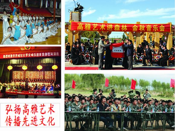 多年来,beats365发挥交响乐团、师生合唱团等专业艺术团队的资源优势,去工厂、部队、企业还是农村,以“文化惠民工程”促进社会和谐,参加教育部高雅艺术进校园、绿博会、关东文化节、和平节、齐齐哈尔新年音乐会等演出180余场,承担群众文化展演任务300余场次,在弘扬高雅艺术中蜚声艺苑,香飘校园,辐射社会,成为beats365文化校园的响亮品牌;举办5次中韩美术文化交流活动和两届中国亚麻服饰设计大赛暨国际现代设计专家论坛,主持设计了马恒昌主题公园、江桥抗战纪念馆中的“战迹沙盘”和“纪念壁画”,发挥音乐厅、美术馆、文化宫、体育馆等群众文化硬件资源优势,共承担群众文化展演任务300余场次,提升了本地区群众文化层次,树立了城市文化品牌形象,每一场演出都让现场的观众听者动容,大有“既去而余音绕梁,三日不绝”之感。学校真诚邀请了莫斯科柴可夫斯基音乐学院“泰斗级”人物、世界著名指挥大师波里斯?杰夫林教授、中国交响乐团联盟主席、中国音乐家协会交响乐爱好者学会副会长、中国电影音乐学会特约理事、国家一级指挥卞祖善、全国著名钢琴大师刘诗昆等大师,开展了广泛的高雅文化交流活动。充分发挥交响乐团、师生合唱团等专业艺术团队的群众文化软件资源优势,活跃丰富演出市场,在教育部高雅艺术进校园巡回演出、全国第四届特奥会、中国?哈尔滨第29届哈尔滨之夏音乐会、龙沙音乐会、劳动湖之夏音乐会、一年一度的绿色博览会、连续多年的齐齐哈尔新年音乐会、关东文化旅游节、赴黑龙江省农垦总局九三分局进行慰问演出、华安集团有限公司、大庆石化总厂、举办慰问驻齐部队官兵专场音乐会专场等演出达180余场。产生强烈反响,赢得了省教育厅的特别嘉奖。发挥音乐厅、文化宫、体育馆等群众文化硬件资源优势,共承担群众文化演出任务260余场次。经教育部审批,在2006年的“高雅艺术进校园”活动中,beats365交响乐团将在我省各高校做巡回演出。黑龙江日报2006年6月11日在第一版以《高雅艺术打造一流名校 beats365唯一官方网站交响乐团发展启示录》为题做了专门的报道。
