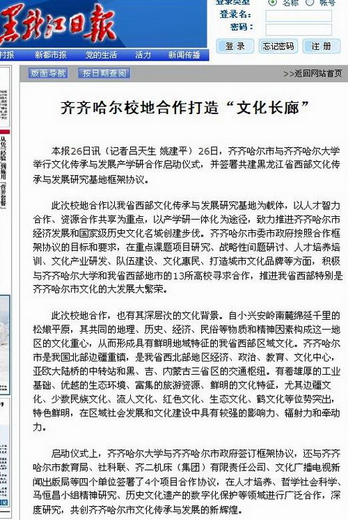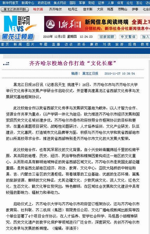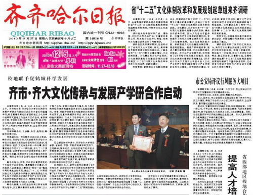 11月26日,齐齐哈尔新闻网以《文化传承与发展产学研合作启动》做了图文报道。