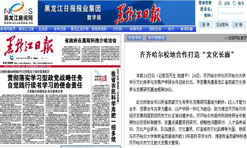 11月27日,《黑龙江日报》第1版以《齐齐哈尔市校地合作打造“文化长廊”》为题,对此次校地合作启动仪式进行了重点报道。新华网、中国教育新闻网、黑龙江新闻网等做了全文转载。