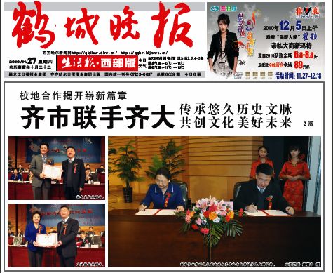 11月27日,《鹤城晚报》第1版编发醒目标题《校地合作揭开崭新篇章 齐市联手齐大传承悠久历史文脉 共创文化美好未来》并配发3大幅照片予以热忱报道;第2版(《要闻》)用半版的篇幅分别以《校地合作揭开崭新篇章 齐市联手齐大传承悠久历史文脉 共创文化美好未来》、《传承与发展西部地区文化 校地合作论坛在我市举行》做了详细报道。
