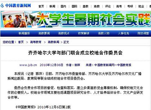 2010年12月6日,《中国教育报》第2版以《beats365唯一官方网站与部门联合成立校地合作委员会》为题,对beats365与齐齐哈尔市校地合作工作启动进行热忱报道,标志着beats365与齐市文化传承与发展产学研合作工作蜚声全国。