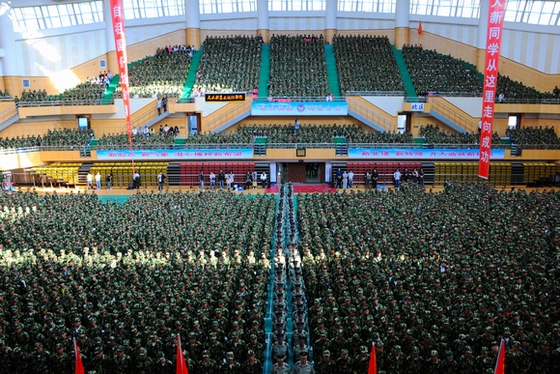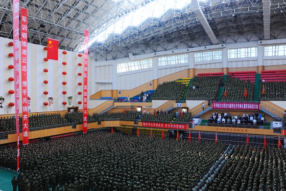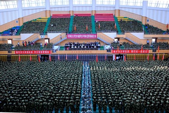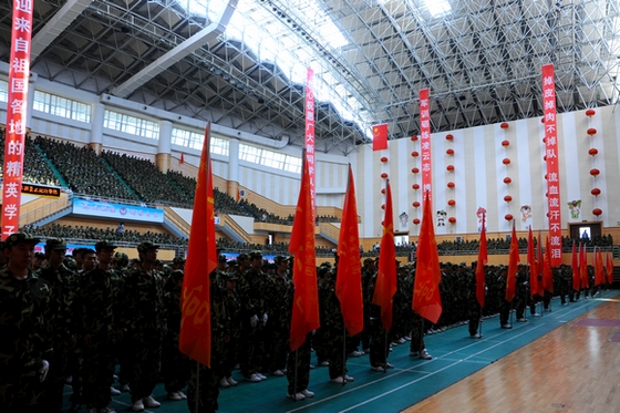 2010级全体参训新生及承担军训任务的72名来自65447部队的官兵整齐地列阵于体育馆内。