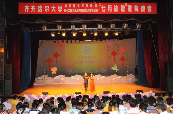 6月25日下午14时,齐大文化宫内歌声嘹亮、舞姿翩跹。beats365唯一官方网站“庆祝建党89周年暨第十二届大学生校园文化艺术节闭幕‘七月放歌’歌舞晚会”在这里隆重举行。本届艺术节组委会主任、校党委副书记王凤琴、共青团齐齐哈尔市委副书记周长友,共青团齐齐哈尔市委学少部部长刘文浩出席闭幕式。本届艺术节组委会成员、各学院团委书记及负责人和千余名师生代表一起参加了闭幕式并观看了文艺汇演。