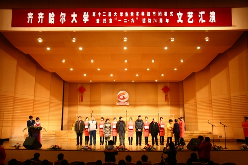 闭幕式结束后,与会校领导和全体师生一起观看了纪念一二?九运动七十四周年文艺汇演。