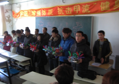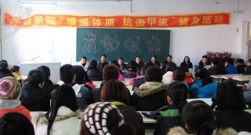 为促进“三型校园”建设,充分发挥学生的主体作用,科学预防甲流,增强学生体质,促进学生健康,外国语学院于12月15日下午举行了“大学生冬季课外活动竞赛暨‘增强体质、抗击甲流’活动启动仪式”。